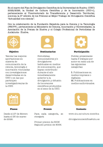 Los trabajos presentados deberán haber contribuido, con una información de calidad, rigurosa y explicativa, a la difusión y divulgación de las investigaciones desarrolladas con la participación total o parcial del personal investigador de la UHU. Aquellos trabajos puramente científicos serán descartados.